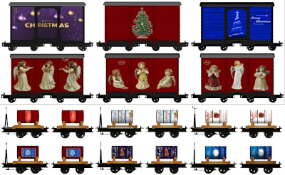 | 06.12.2018 UPDATE ! 26.12.2017 Weihnachtsmodelle ![]() V80_WX2017_01 | ![]() ![]() | G-Wagen 11 Modelle braun, braun/sw, grün, grüm/sw, grau, grau/sw, blau, blau/sw, dunkelrot, dunkelrot/sw, dunkelrot mit Weihnachtsmotiven (für Nikolaus-Express) Die Türen lassen sich aufschieben. Baujahr: 1918 LüP: 6 760 mm Update: Drehgestelle mit 3D-Federn Lore mit Faß beladen 12 Modelle Lore mit und ohne Bremse, jeweils mit Faß beladen. "Glühwein Rot", "Glühwein Blau", "Glühwein Blau 2", "Punschwerkstatt", "Rum-Punch", "Snöflingor-Glögg" Baujahr: ???? LüP: 2 280, 2 020 mm Im Download auch enthalten: Weihnachtsmodelle 2017: Triebfahrzeuge & Personenwagen |