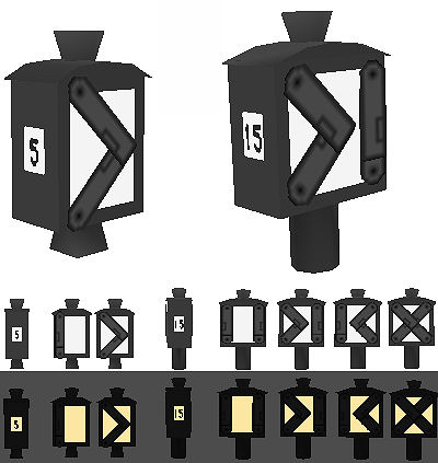 Für DKW, EKW, ABW, und DWW wurde ein etwas breiterer Laternenkasten mit 4 Signalblenden verwendet; auch bei ortsgestellten Weichen, dann per Gestänge angesteuert.